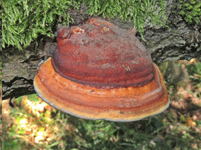 | Fruchtkörper des Echten Hausschwammes (Serpula lacrymans) an einer Kellerdecke; das Eckbild zeigt die braune Fruchtschicht – das Holz wird im Abbauprozess schwammig. | Dauerporenschwamm (Perenniporia tenuis): Poren wie ein Schwamm zur Bildung von Sporen. | Fruchtkörper des Rotrandigen Baumschwamms (Fomitopsis pinicola) | |